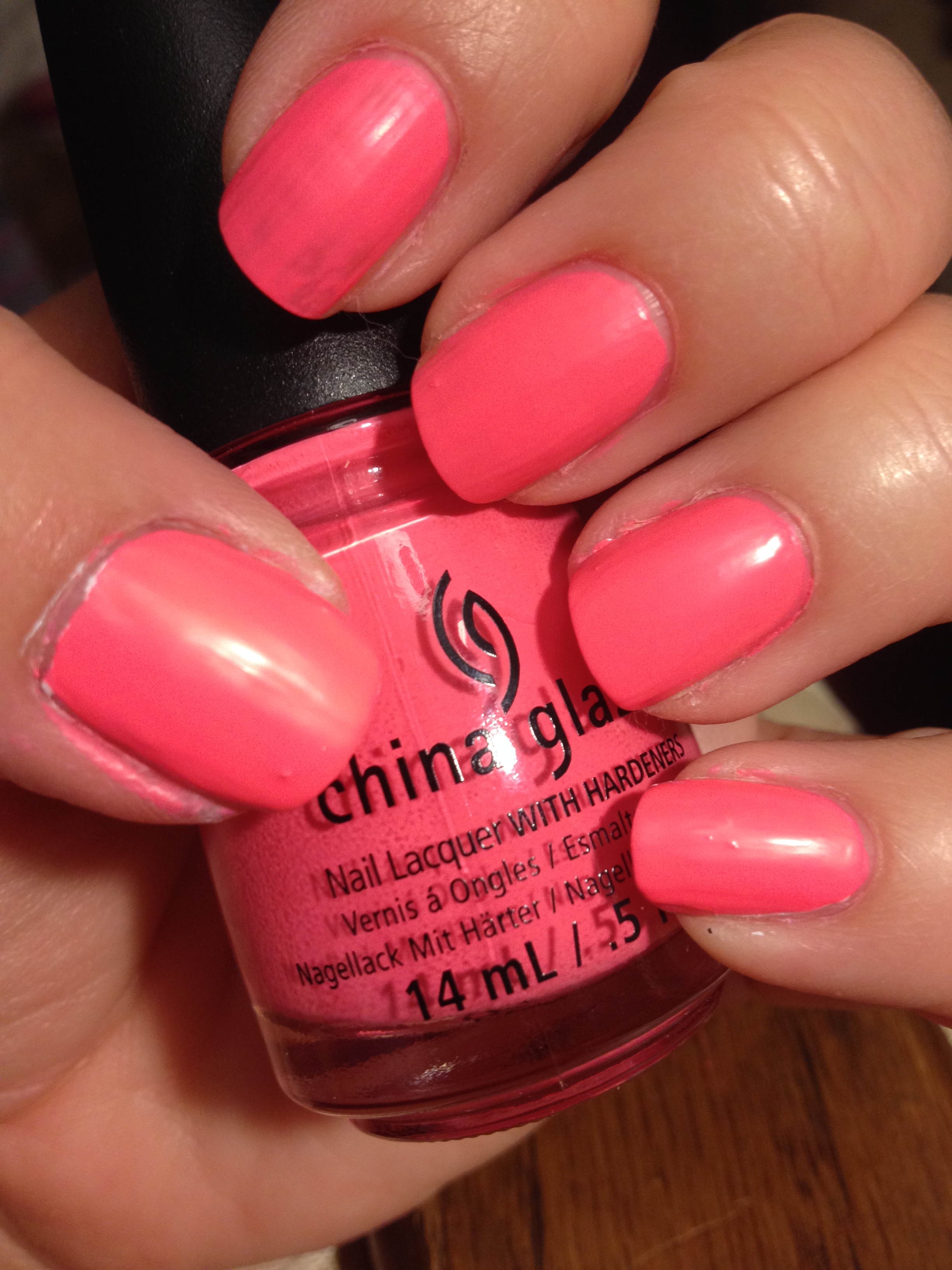 A hot pinky-coral. China Glaze makes some really great neon formulas, and this is one of them. Three coats without a white base looks great.