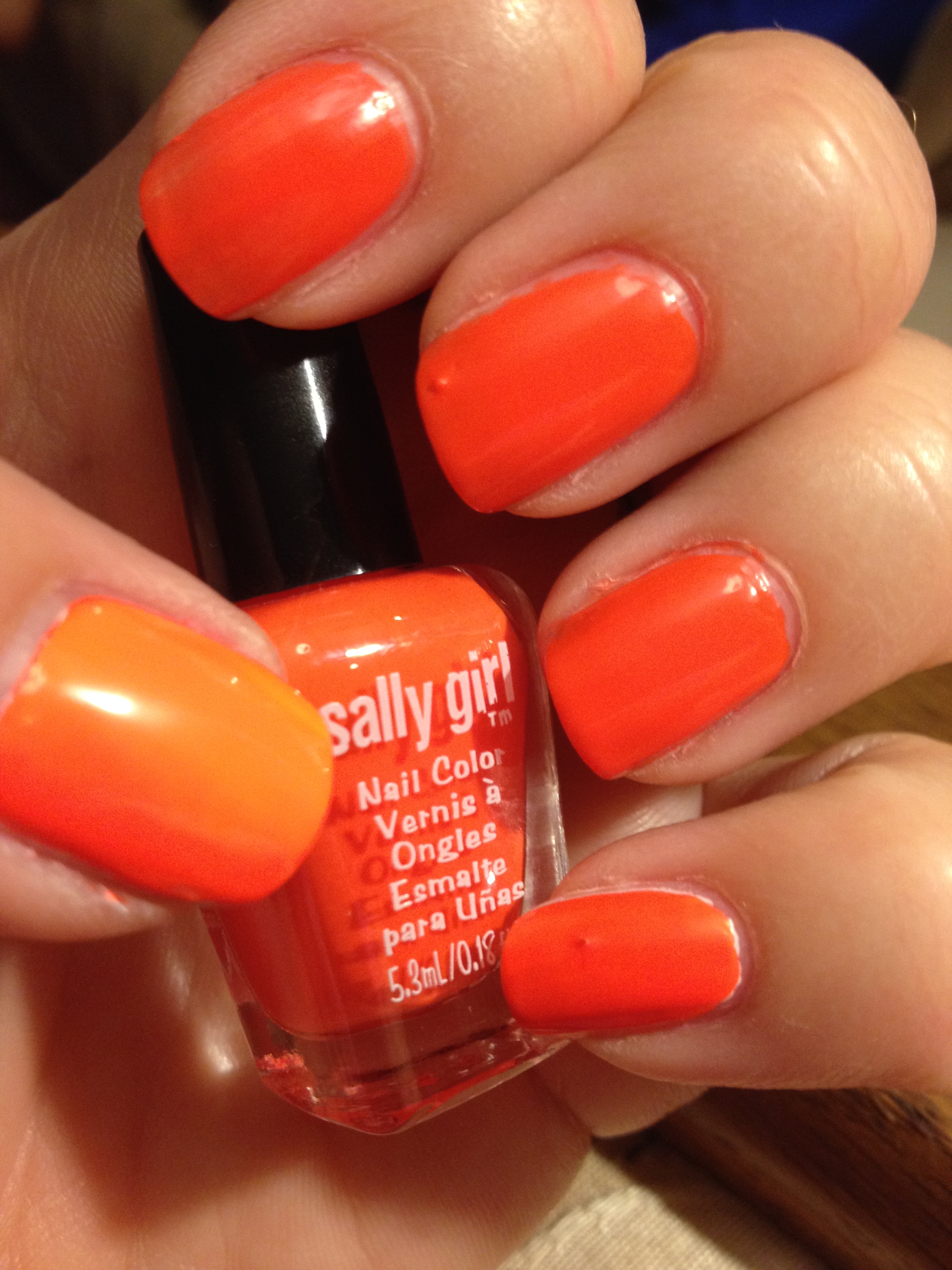 This is actually a bright coral. This may not be a true neon, because the formula dries glossy instead of matte. Three coats of this looks good without white underneath.