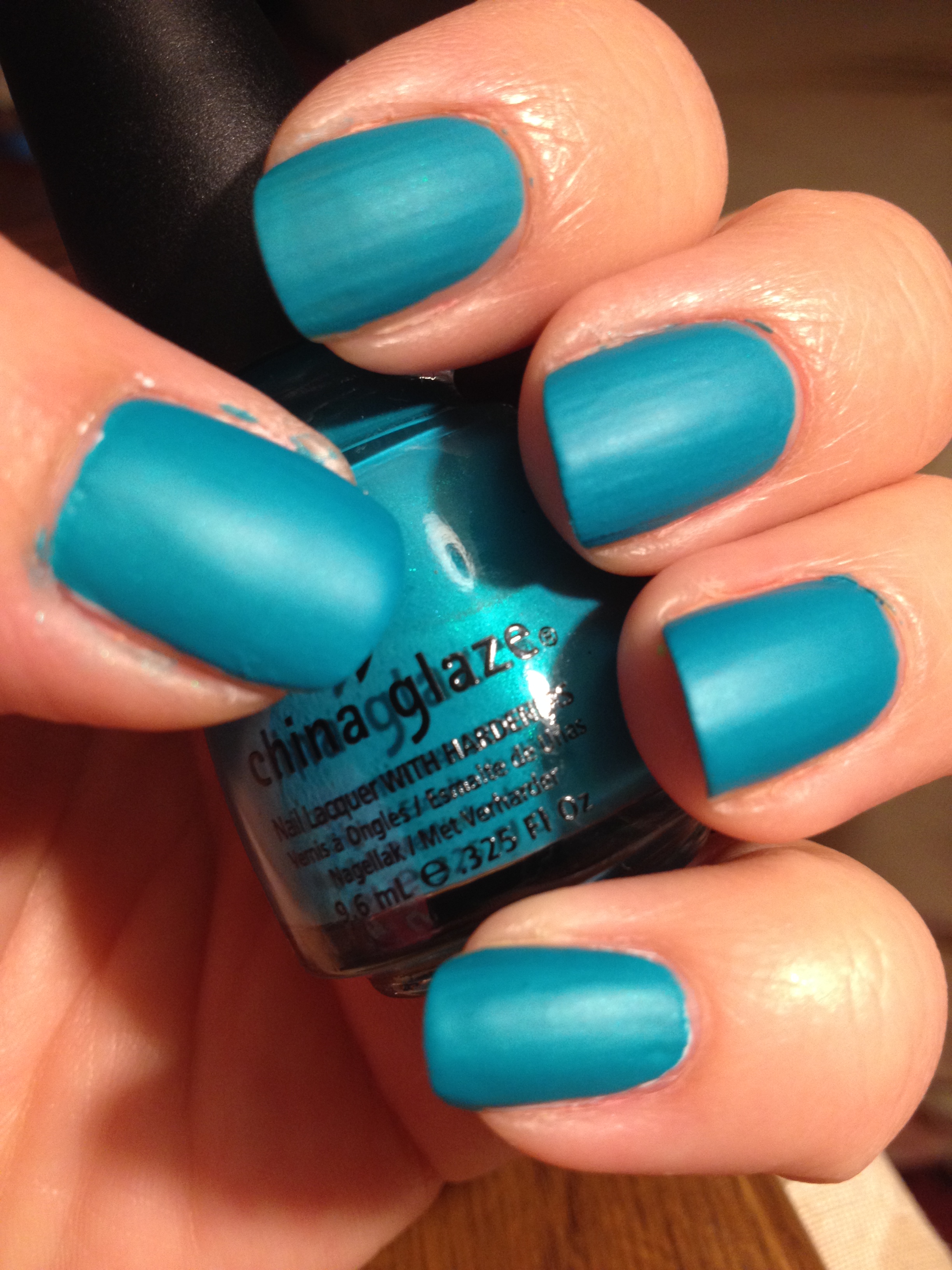 I LOVE this color! This formula is great, so you don’t need a white base. This is not a typical neon color, but it is part of China Glaze’s neon collection. This looks really cool with it’s matte finish, but there is a greenish shimmer in this polish that really shows up when you put a shiny top coat over it. This color, along with the last two, are actually colors that you can get away with wearing year-round. Did I mention that I love this color?