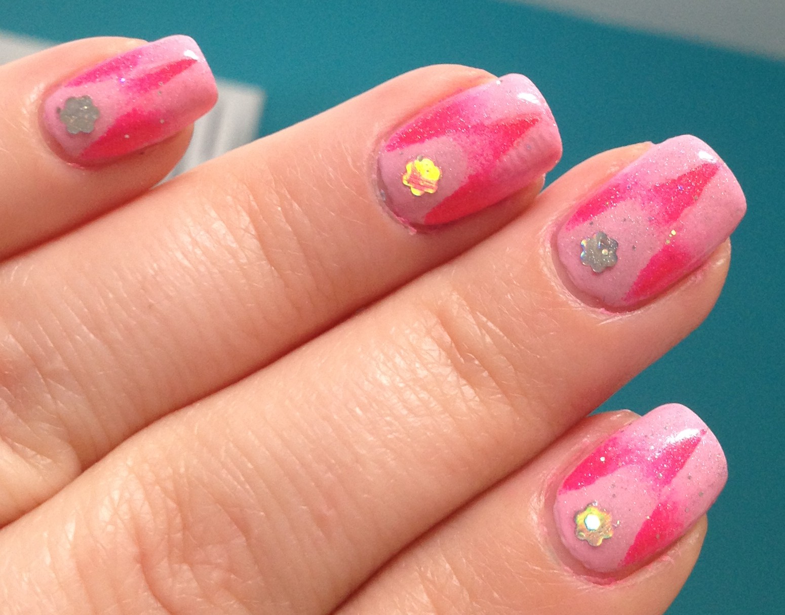 I took a bit of a short cut when doing the gradient for my first coat. I just pained my nails two coats of the light pink and let that dry. Then I brushed a little bit of the dark pink polish on a makeup sponge and dabbed that onto the nail, starting at the tip and moving up toward the middle of the nail. As I blotted the polish from the sponge to the nail, the polish starts to dry, so less and less transfers to the nail. That’s how you get the gradient effect. I went over the tips again with a little more polish on the sponge just to make sure they were nice and bright. After I finished my gradient, I applied a quick dry top coat to help blend it together.