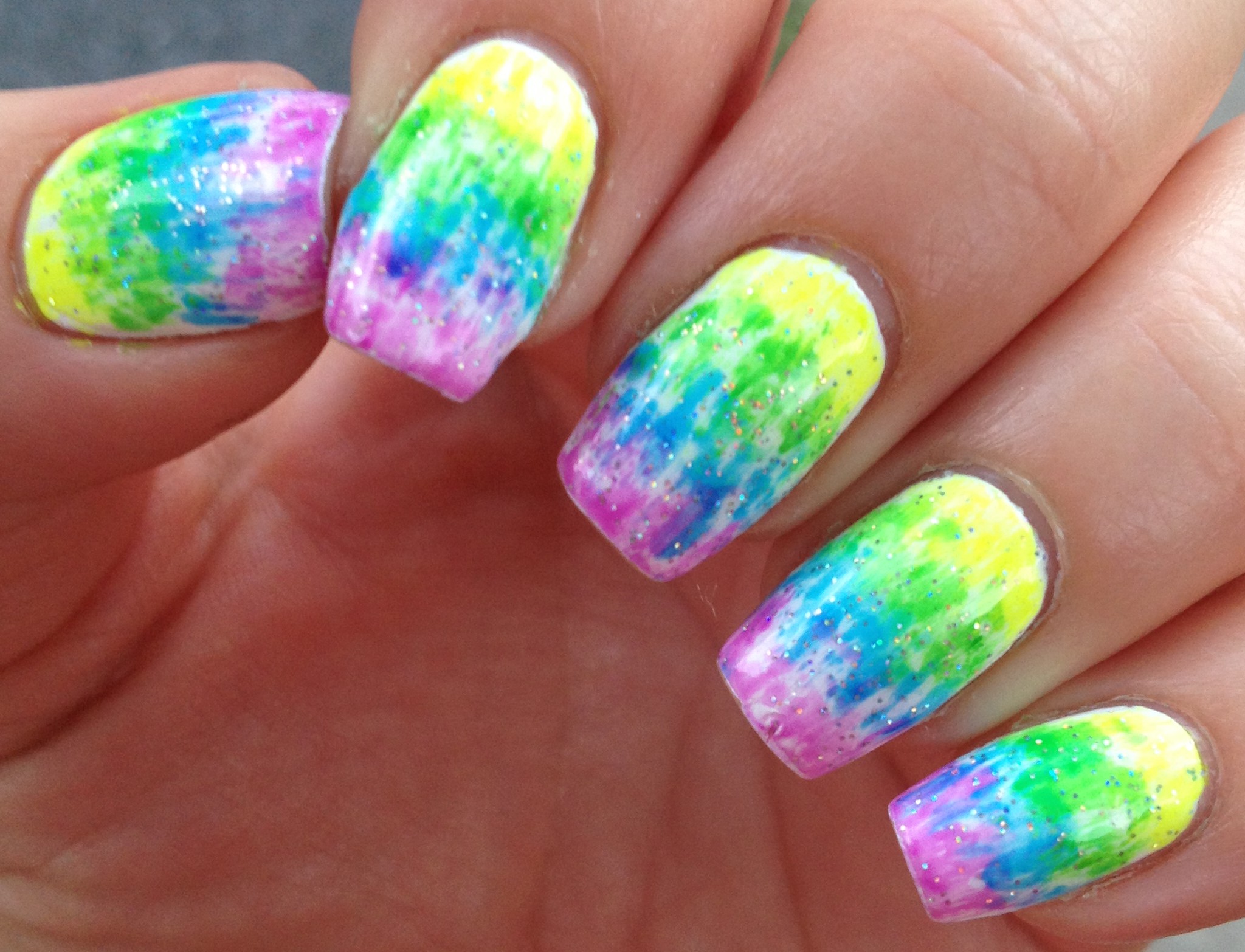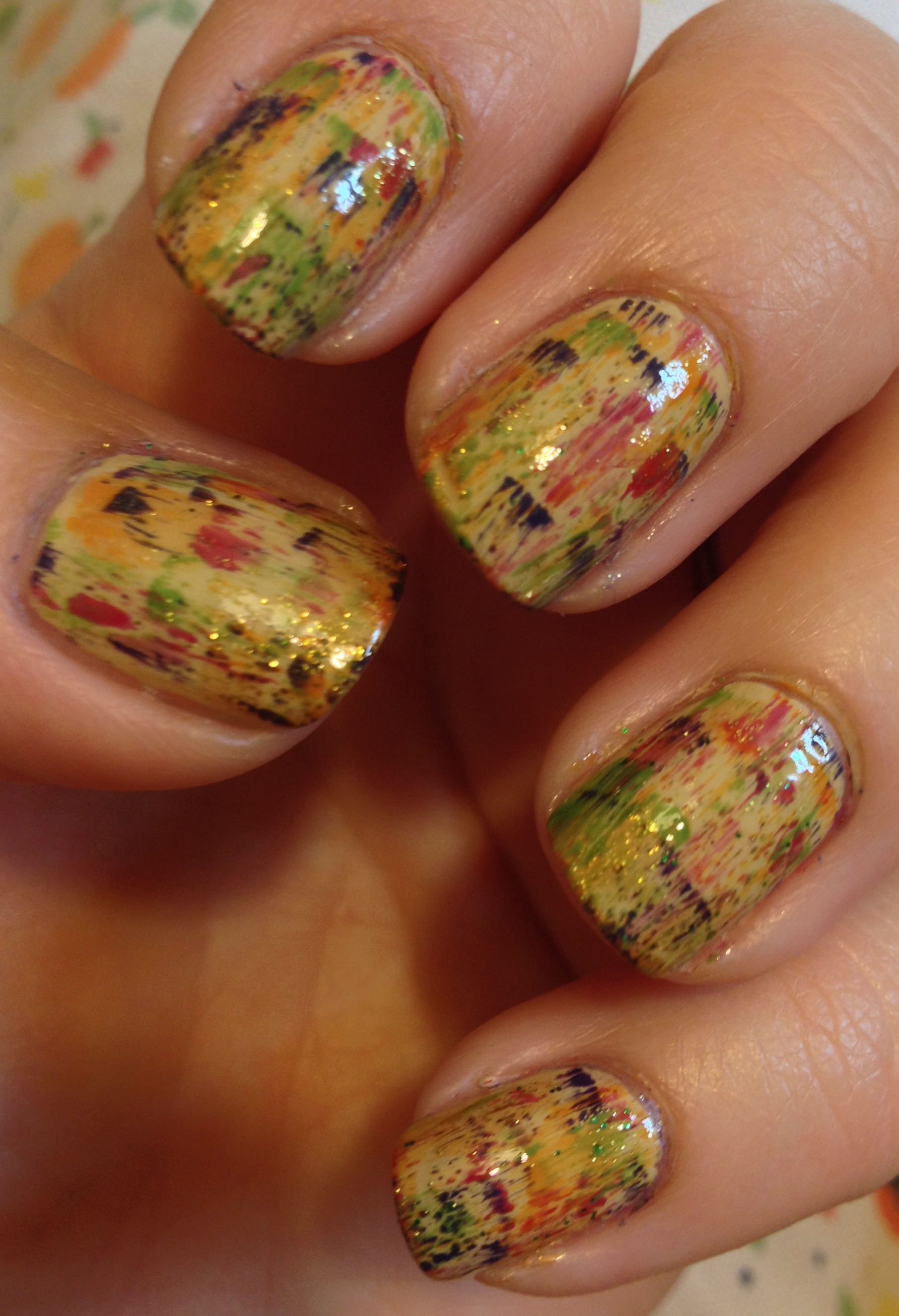 I then did the exact same thing with the purple polish, and then with the green polish, kind of filling in the empty spaces. Although I intended to take pictures of each step of this manicure, I didn’t. Fail. See, I’m usually watching something important on TV (like Sister Wives or Dance Moms) while I’m doing my nails, so I tend to forget to take pictures of each step. I just crank along and then I’m like, “Oh dang, I’m done… And I only have 2 pictures.”