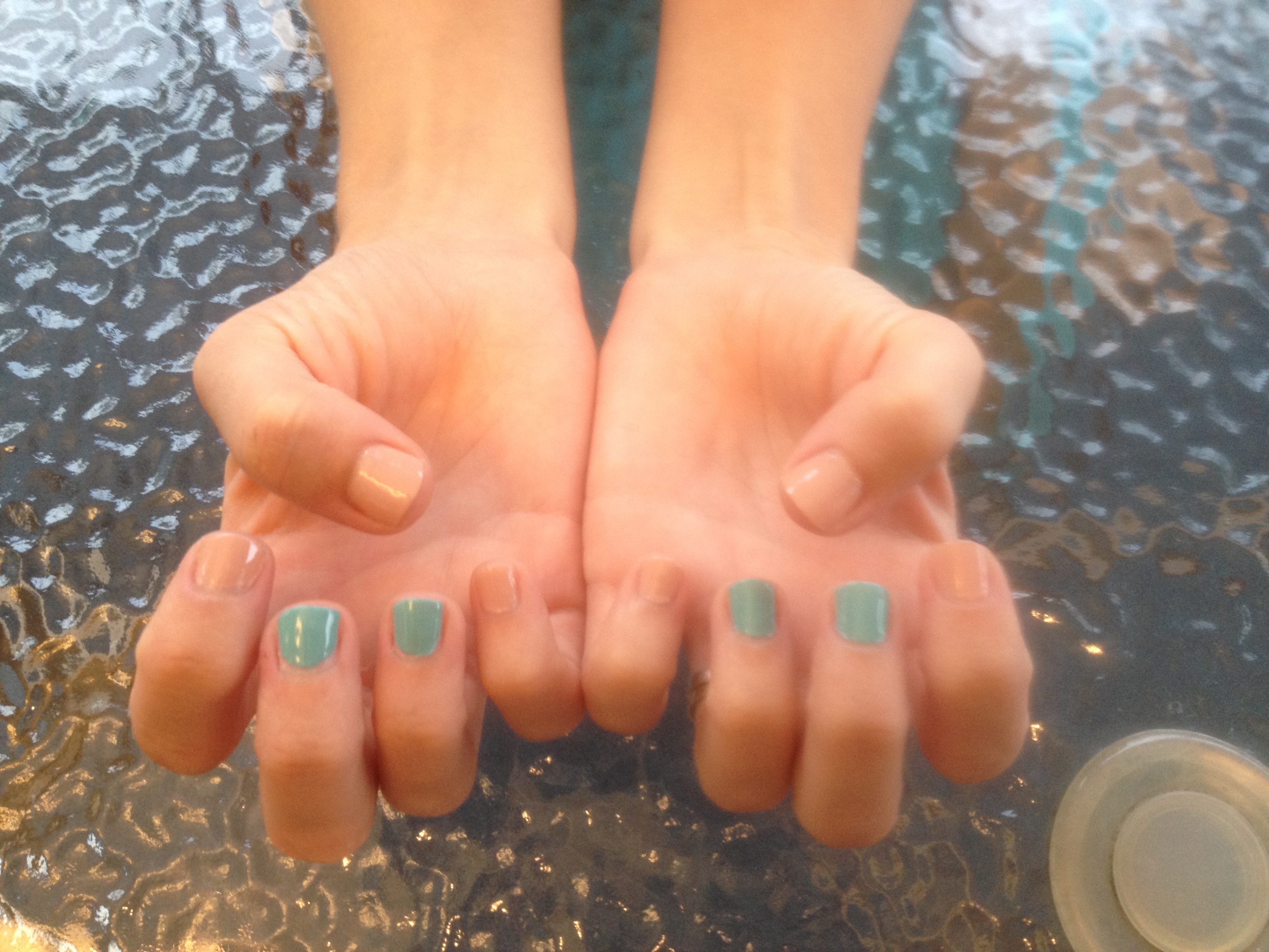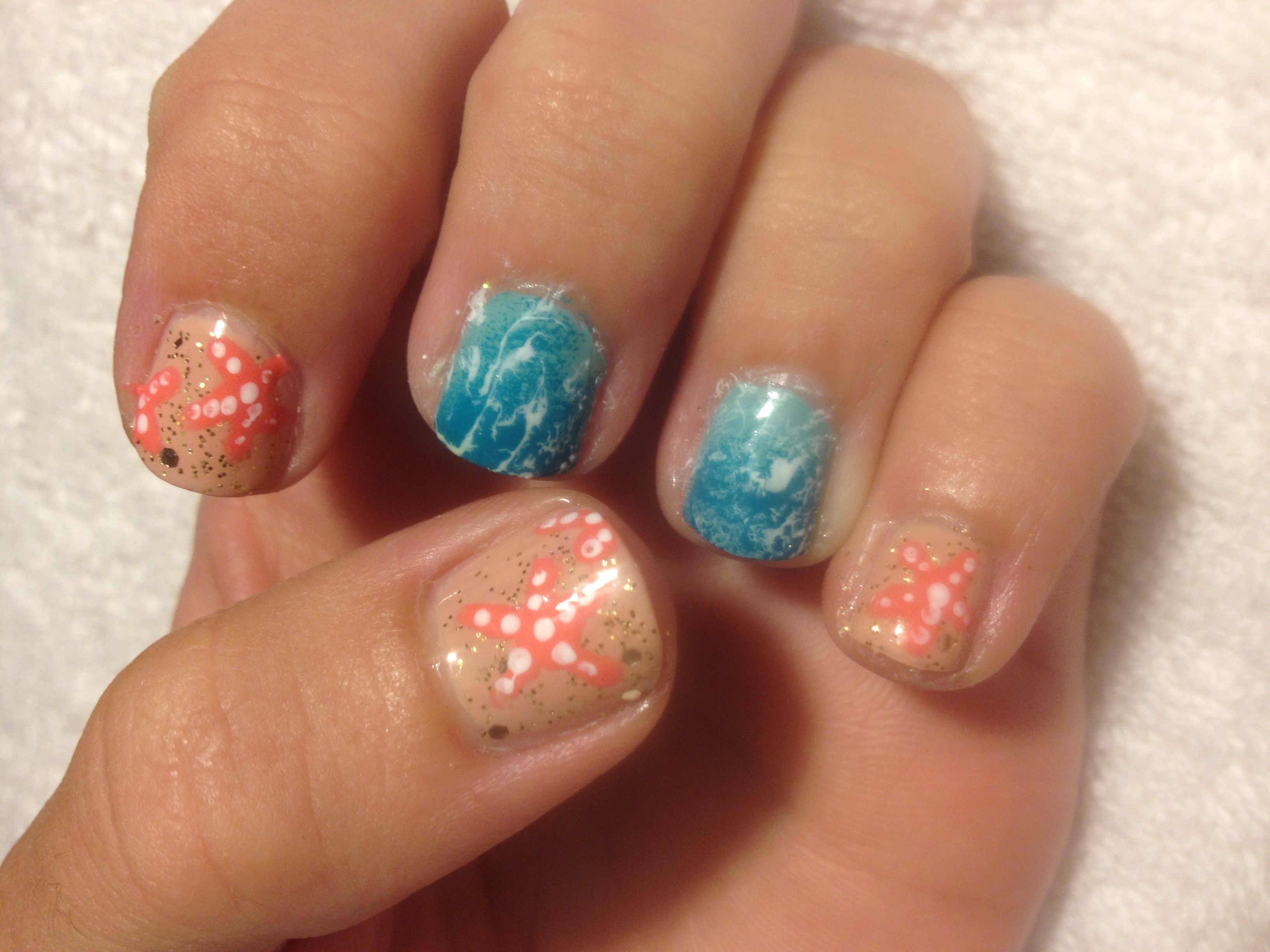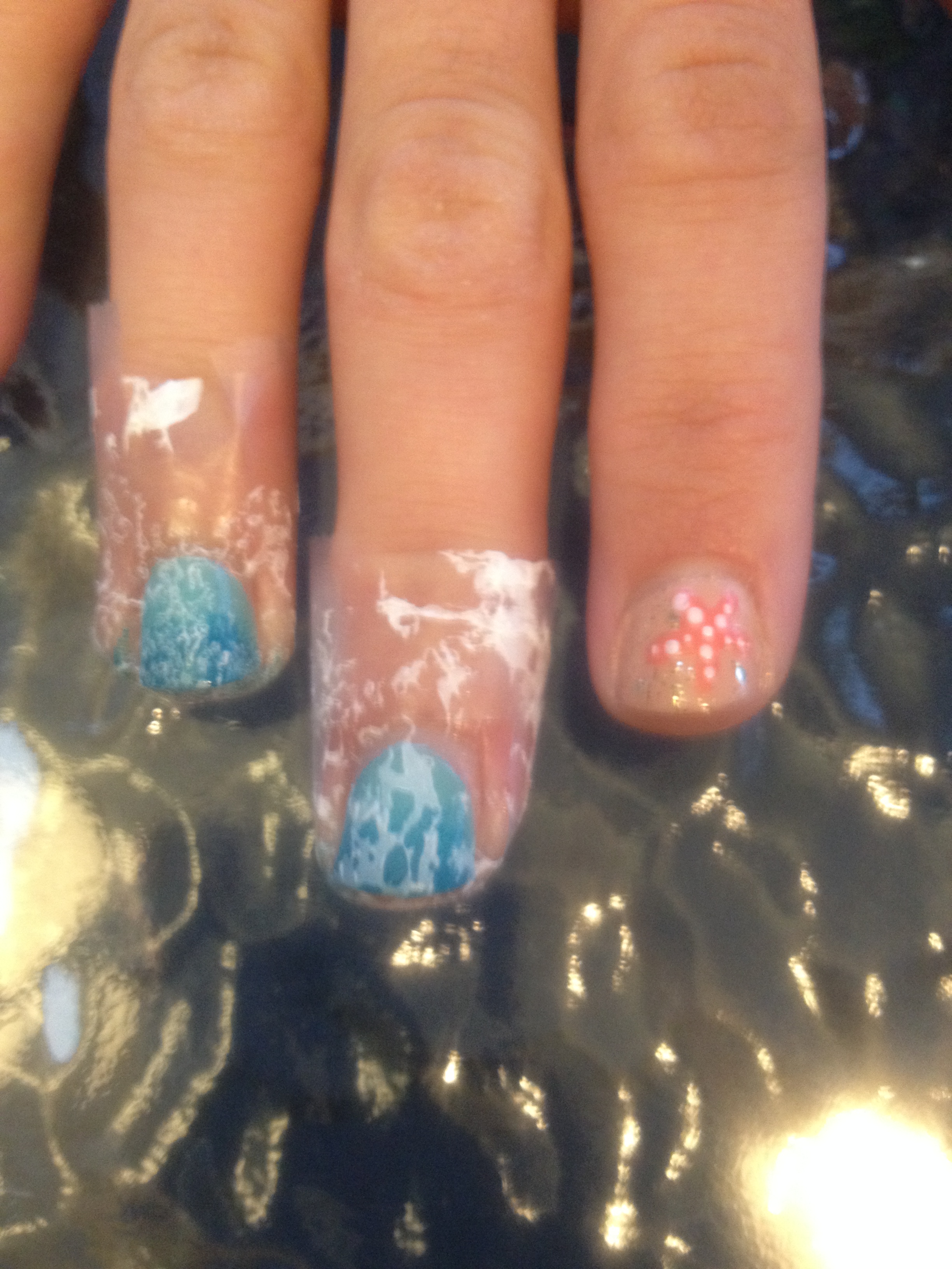 Here in PA, we have about one more month to sport overtly beachy nails, so let’s get to it! I am still digging my current mani, so I asked my little sis if I could borrow her nails for this little tutorial. Here’s the finished product: