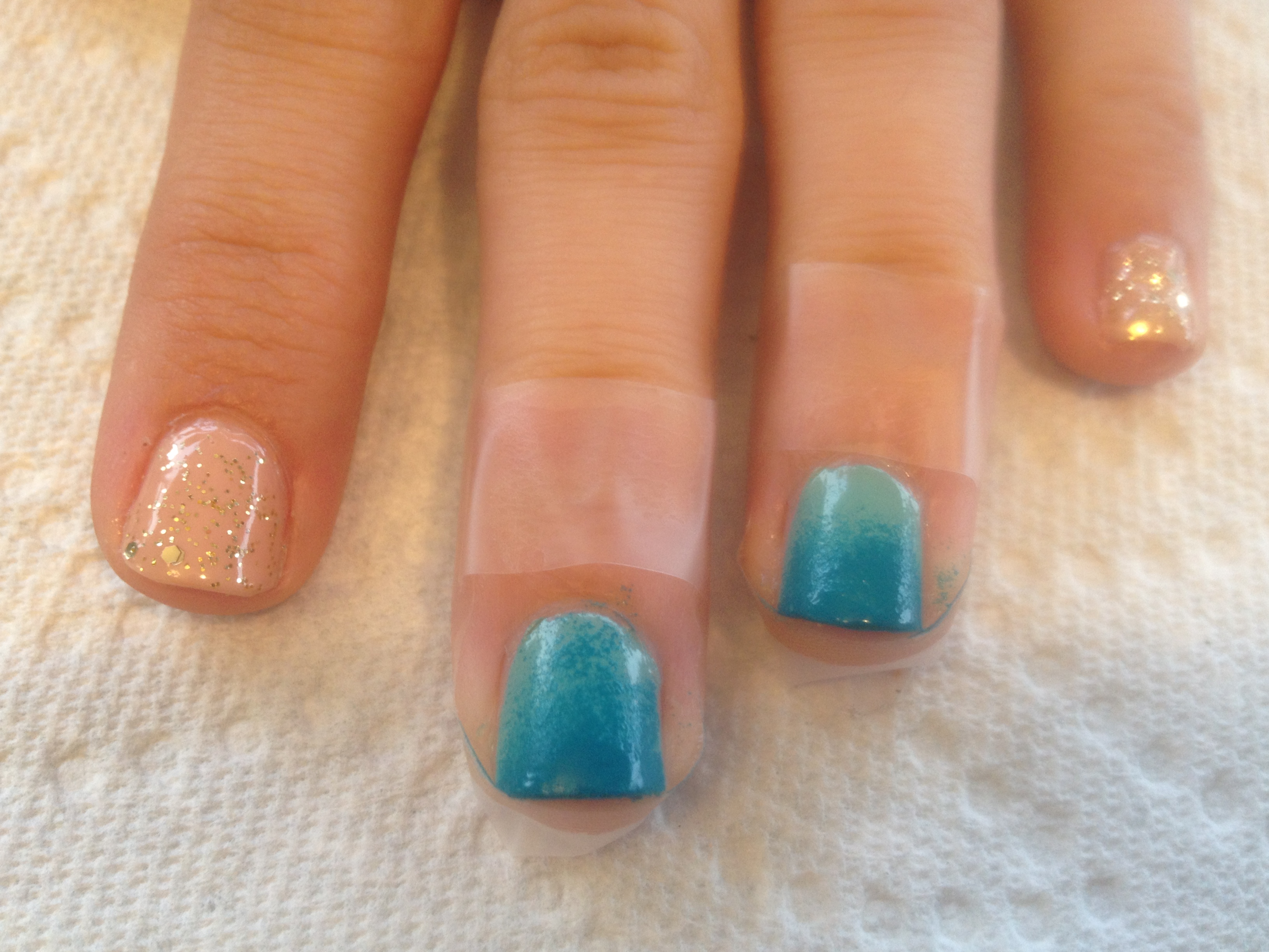 Then start dabbing the sponge lightly at the very tip of the light blue nails. As the polish begins to dry on the sponge, continue dabbing about halfway up the nail. Work carefully and don’t get too crazy here. It’s easy to add more dark blue polish to the nail if you need to, but if you sponge too vigorously and get too much dark blue polish on the nail, there’s not much you can do to fix it. Here’s what it should look like after this step: