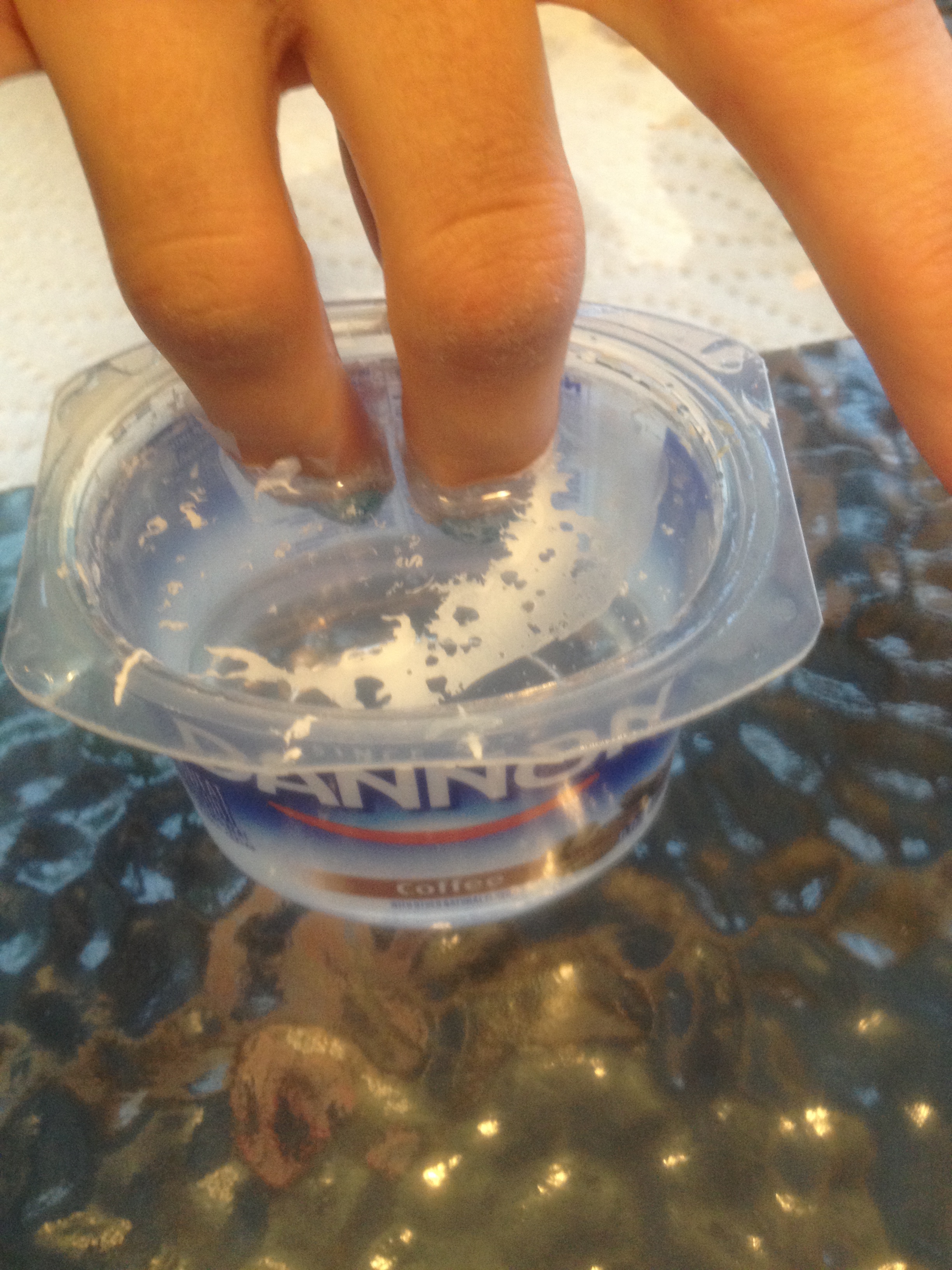 Next, take your small disposable container and fill it with your room temperature water. I just pulled a yogurt container out of my recycling bin. (What you do not want to use is a Styrofoam cup. Nail polish will eat through Styrofoam and leave you with a big mess.)