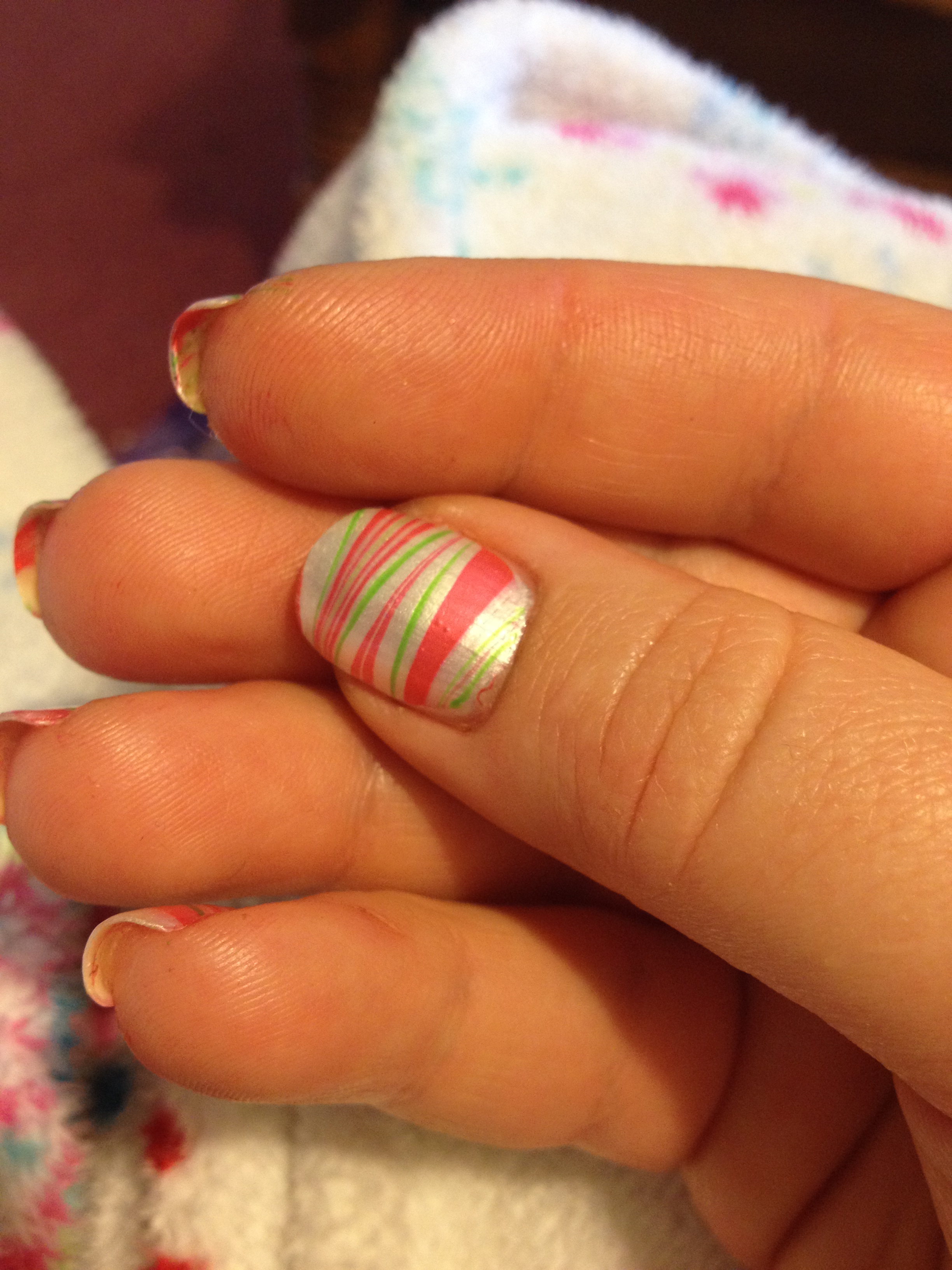 Specifically, I used (left to right): Wet N Wild -French White Creme, Wet n Wild Megalast – I Need a Refresh-Mint, Jordana – Boy Oh Boy, Wet n Wild – Blazed, NYC – Fashion Safari, La Colors – Dizzy. (Yeah, my bottle of Blazed got into a fight with a bottle of grey polish inside my suitcase on a flight. The grey bottle lost.)